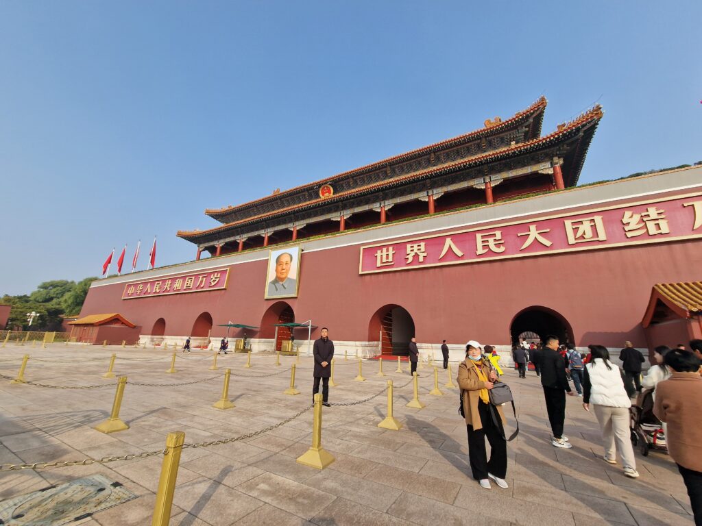Tras unas cuantas fotos desde esta zona, nos pusimos rumbo a pasar por la famosa puerta de Tiananmen. Es la puerta monumental que separa la Plaza de Tiananmén de la Ciudad Prohibida, y justo en el centro está el famoso retrato de Mao Zedong. (Ver ubicación Amap)