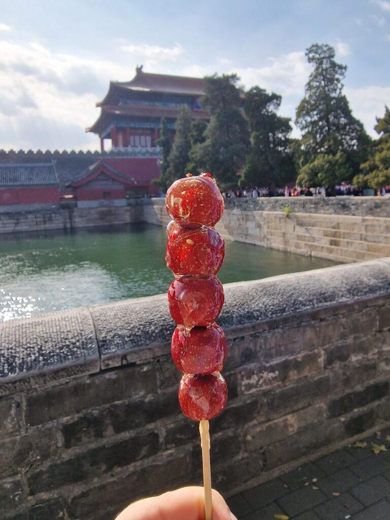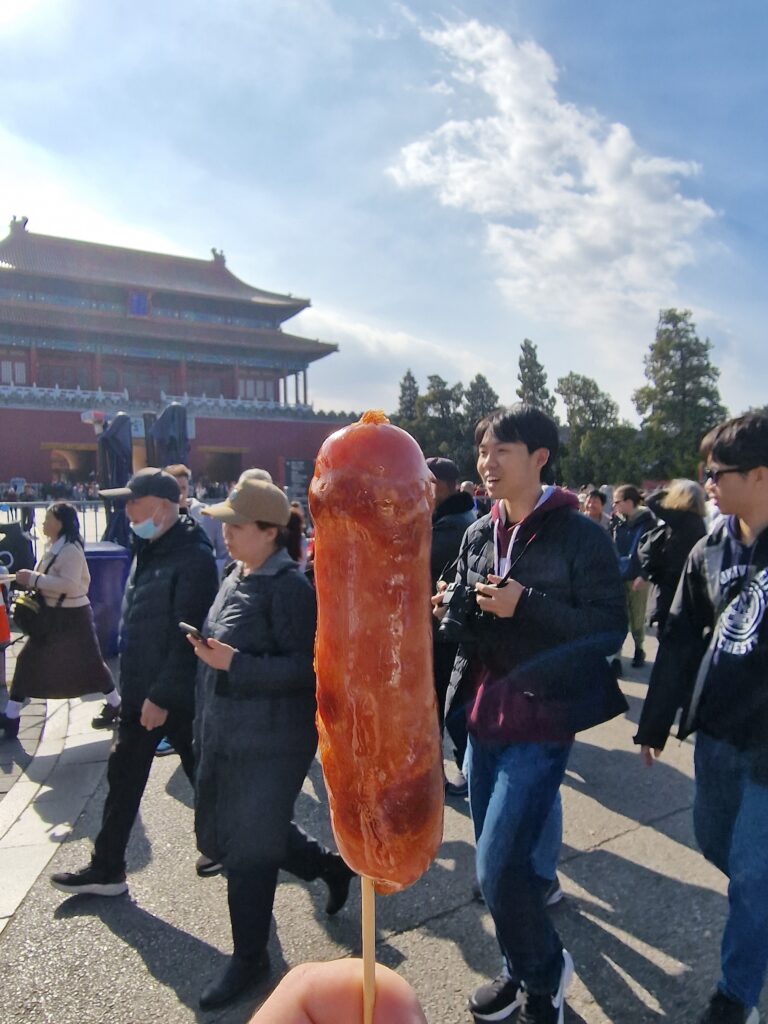 Compramos una brocheta de mini manzanas de caramelo, muy típica por allí, de hecho las verás por muchos sitios, y compramos también una especie de salchicha, la cual creo que era de cerdo, y que estaba muy buena, la verdad!