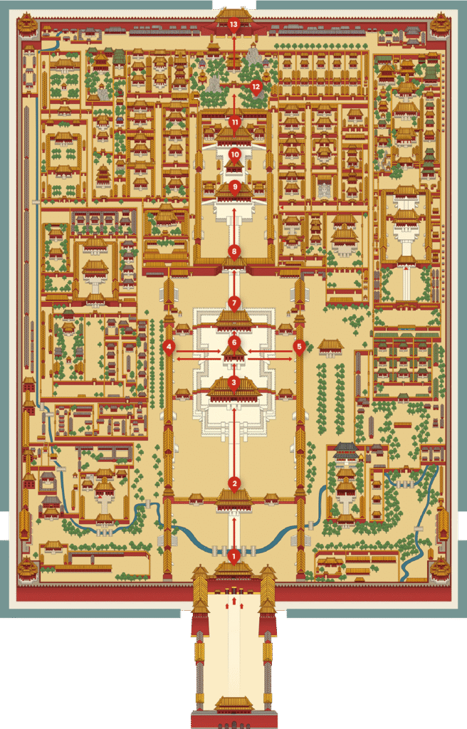 Nosotros decidimos visitar la ciudad prohibida haciendo el recorrido «corto». En este, según la página oficial, se tardaban 2 horas en visitar la ciudad prohibida en línea recta, os dejo por aquí la foto.