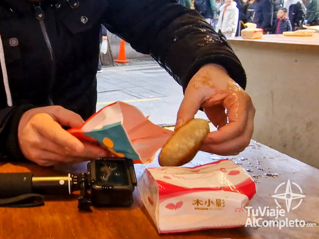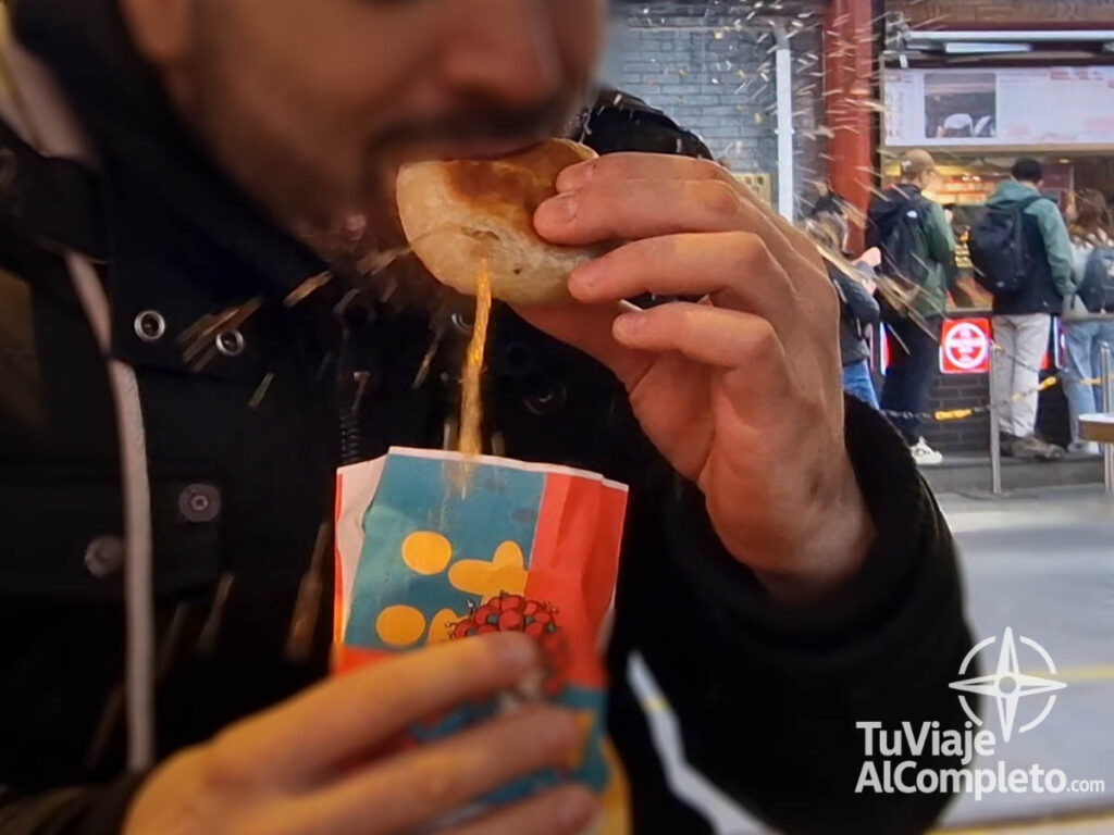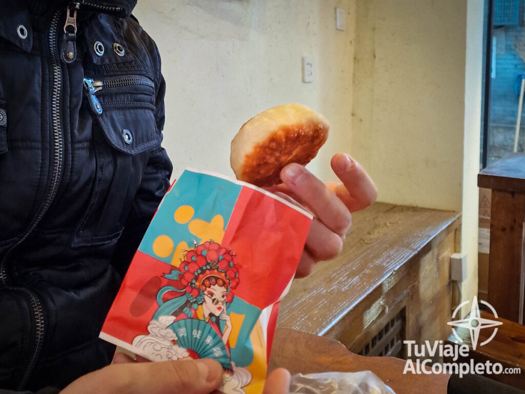 Allí mismo encontramos un local que vendía una especie de bollitos calientes rellenos de carne y tenían una pinta estupenda. Cuando estábamos pagando, la señora nos dijo algo en Chino, que obviamente no entendimos nada, pero supusimos que dijo algo cómo «Tened cuidado que está caliente».