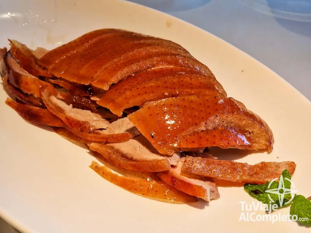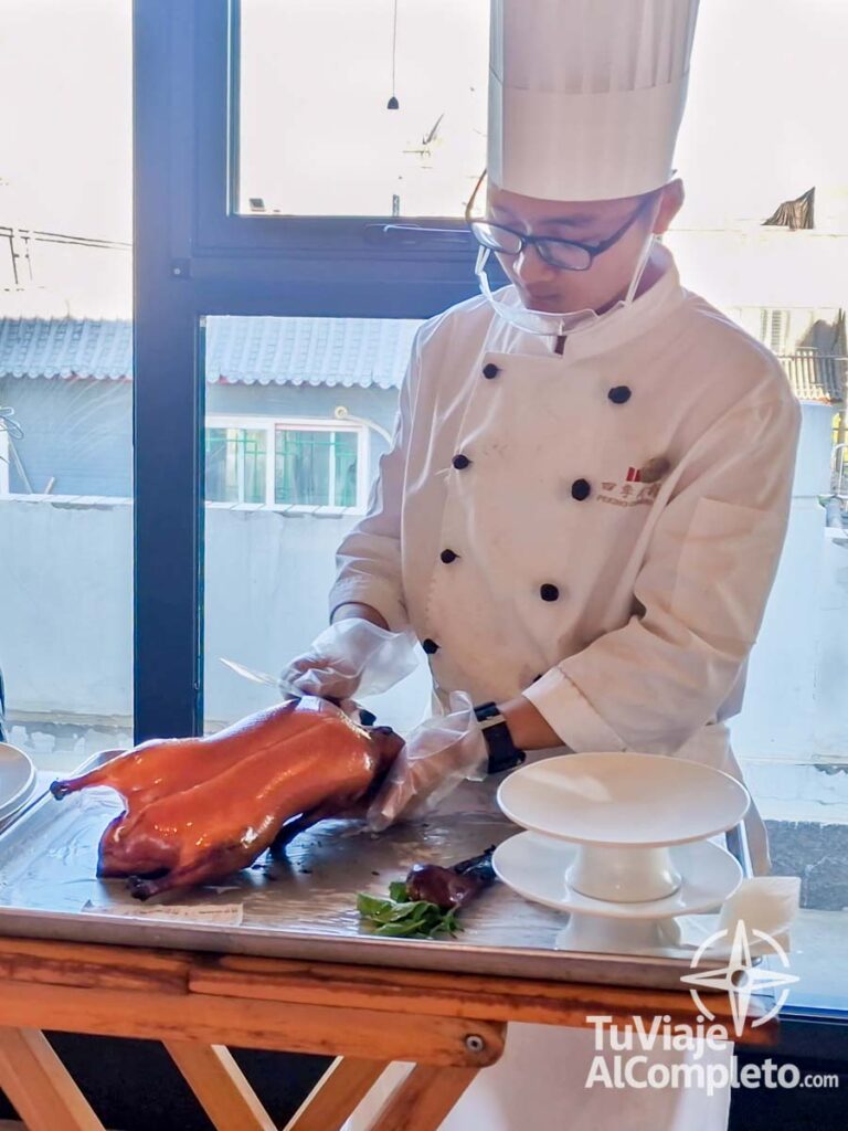Tras 5 minutos, abrieron la puerta y entraron con un carro en el cual se encontraba un pato entero en su parte superior. El camarero, empezó a cortar el pato enseñándonos el proceso de despiece, y colocando todos los trozos cuidadosamente en un plato para nuestra degustación.