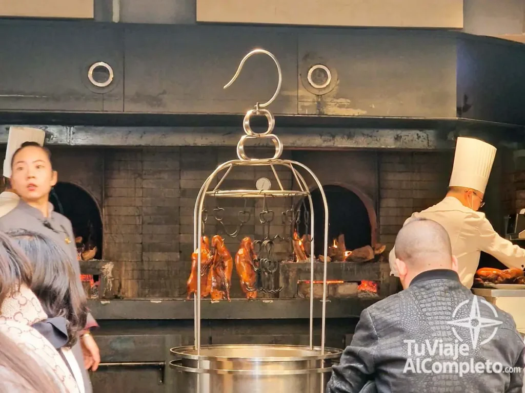 Desde esta sala de espera podíamos ver cómo cocinaban en unos hornos enormes de leña a los patos. No os podemos decir cuántos patos vendían al día, pero el trajín que había allí montado, entre cocineros, patos y gente esperando para comer, era considerable!