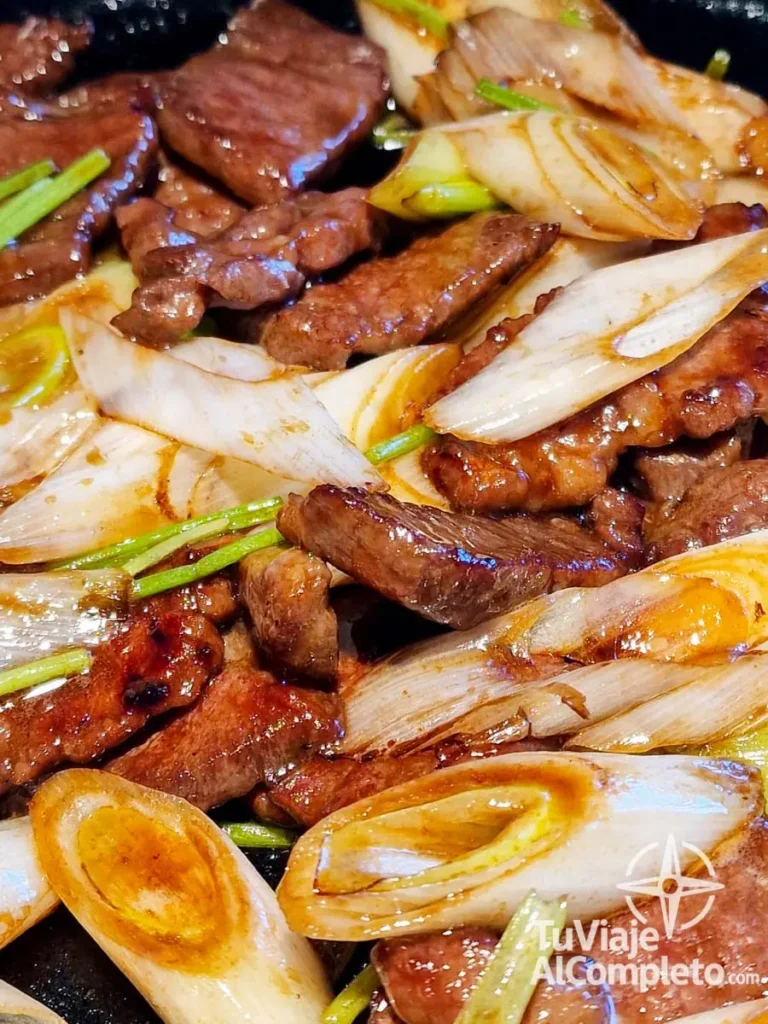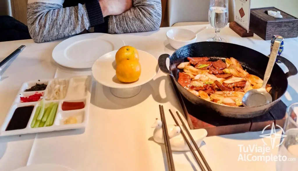 Al sentarnos en la mesa ya teníamos pensado qué comer, y pedidos un plato de carne de wagyu 3A con cebolleta, una especie de albóndigas fritas de carne, medio pato laqueado con condimentos y una especie de tortitas.