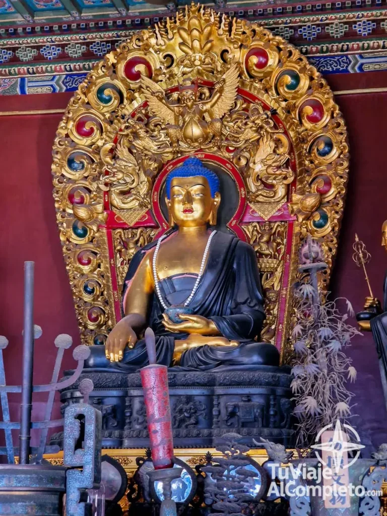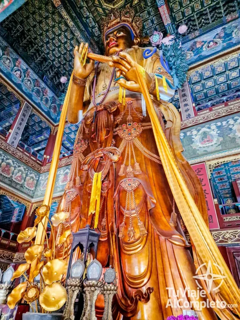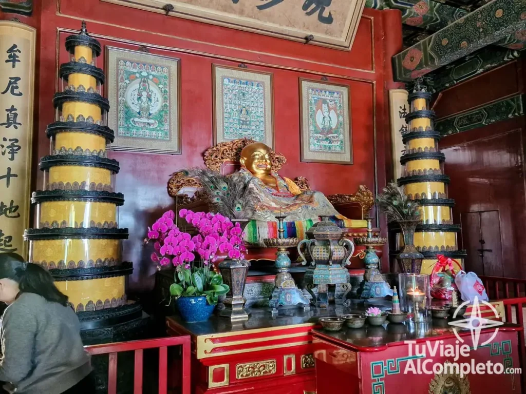 Por en el cuarto y último pabellón central, fue donde nos llevamos la gran sorpresa. En el nos encontramos con la enorme estatua del Buda Maitreya, el Buda del futuro. Nos impresionó su gran tamaño, ya que mide más de 18 metros de altura y está tallada en una sola pieza de madera de sándalo. Precioso!
