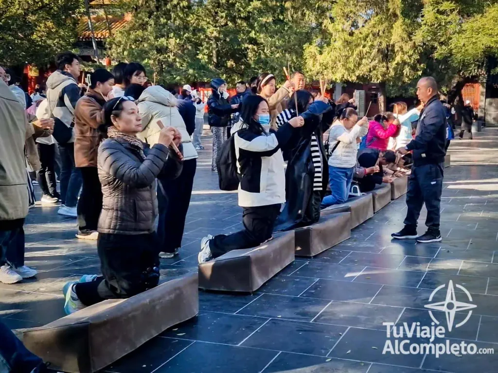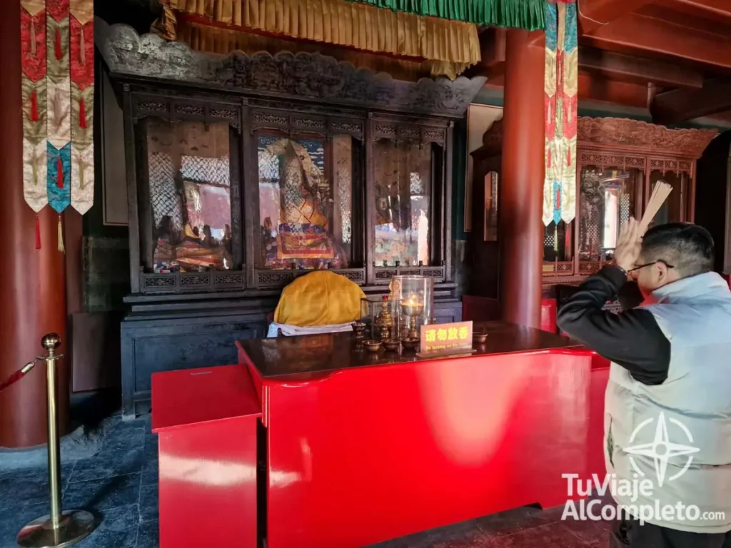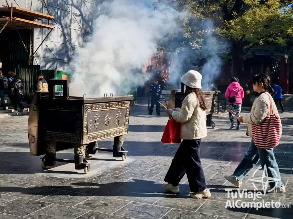 En el patio central había una zona donde encender el incienso. Pudimos ver cómo lo encendían, y cómo después se arrodillaban sobre una especie de base acolchada, rezaban, hacían tres o más reverencias colocando los palos de incienso en la frente y, después, dejaban los palos en un cajón donde se iban consumiendo lentamente.