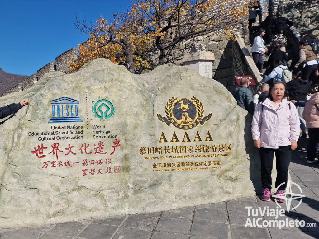 Una vez arriba nos encontramos con la piedra que indica que estamos ante una atracción con cinco “A” (AAAAA), la máxima categoría turística en China. Este distintivo se otorga solo a lugares considerados de gran importancia histórica y cultural, con servicios e infraestructuras de primer nivel, así que no nos sorprende que la Muralla China esté en este selecto grupo.
