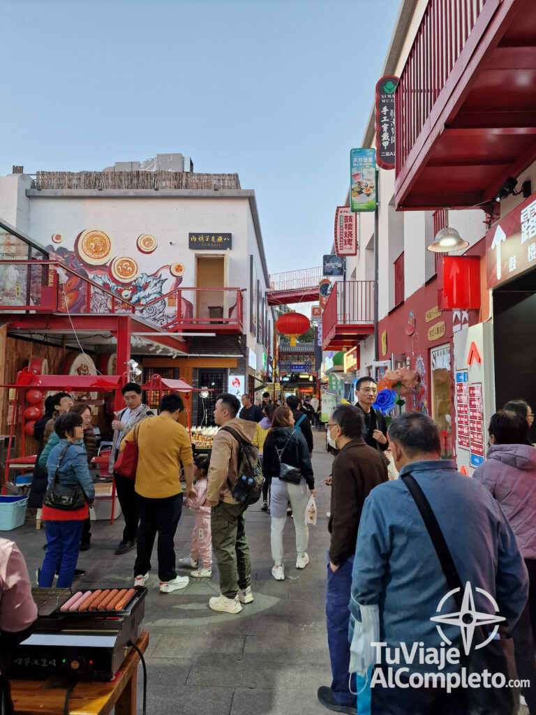 A mitad del callejón hay una especie de mercado gastronómico (en realidad, se trata de varios locales de comida uno junto a otro, con mesas compartidas. Encontrarás varios a lo largo de tu viaje por China), donde puedes pedir diferentes platos y sentarte a comer en común. Dumplings, brochetas, platos fritos, frutas… un poco de todo y siempre con ambiente local.
