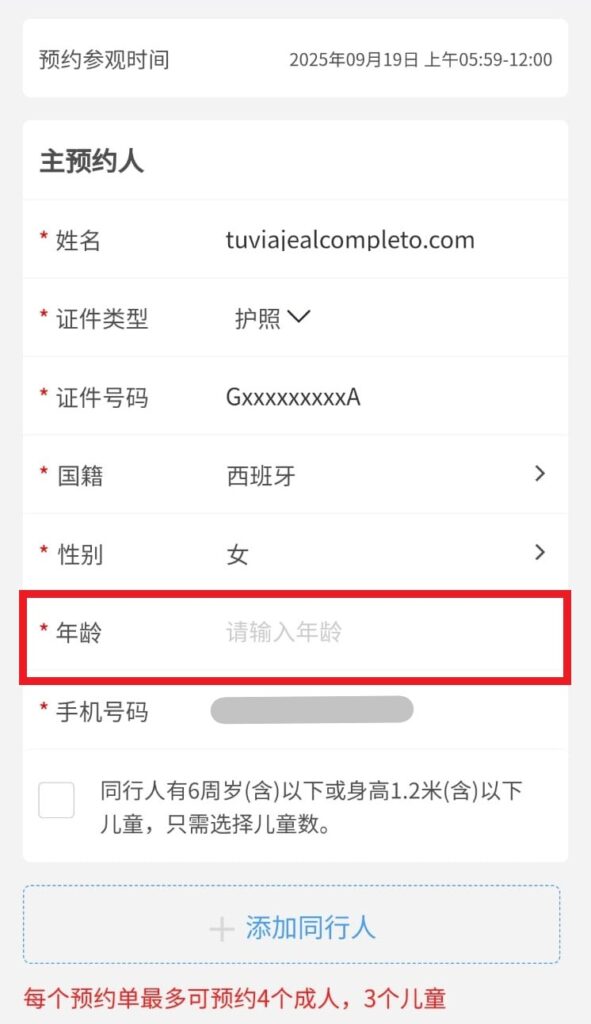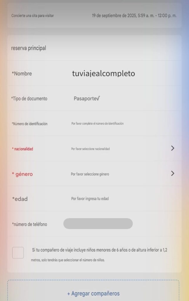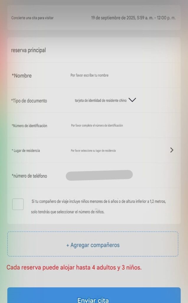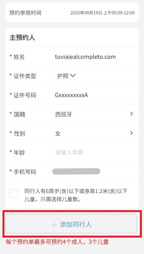 12. Para añadir más acompañantes selecciona la siguiente opción y rellena sus datos. En cada reserva se puede añadir un máximo de 4 adultos y 3 niños.