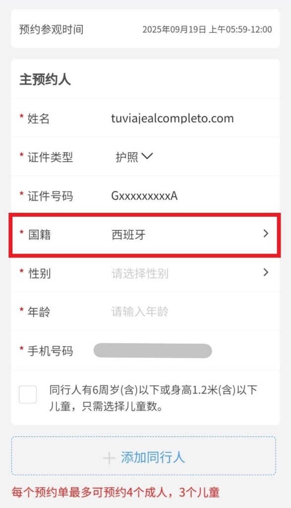 9. Haz clic en el apartado “Nacionalidad” y escribe tu país de nacimiento en chino. Para ello, abre el Traductor de Google, escribe el nombre de tu país (por ejemplo, España), tradúcelo al chino tradicional, copia el resultado y pégalo en el miniprograma de WeChat.