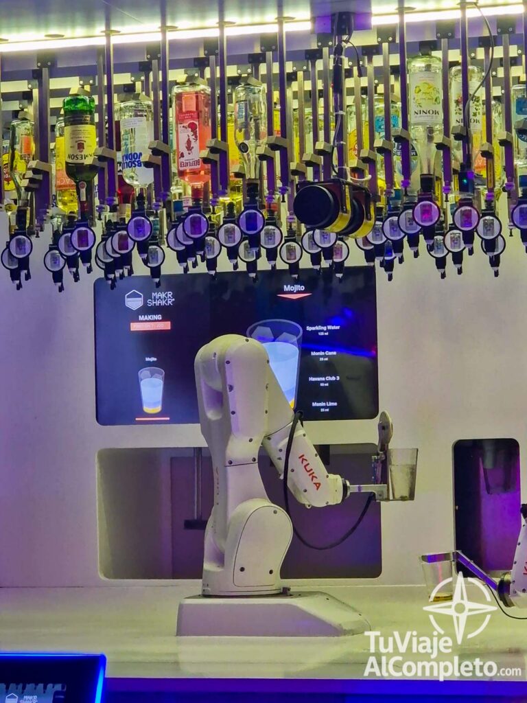 Uno de los detalles más curiosos es que en una de las plantas los cubatas los preparan unos robots. Se trata de una sala con varias pantallas, donde eliges tu bebidas, y en una especia de «escenario» los camareros que en este caso se tratan de unos brazos articulados, te preparan tu bebida. Una experiencia de lo más curiosa!