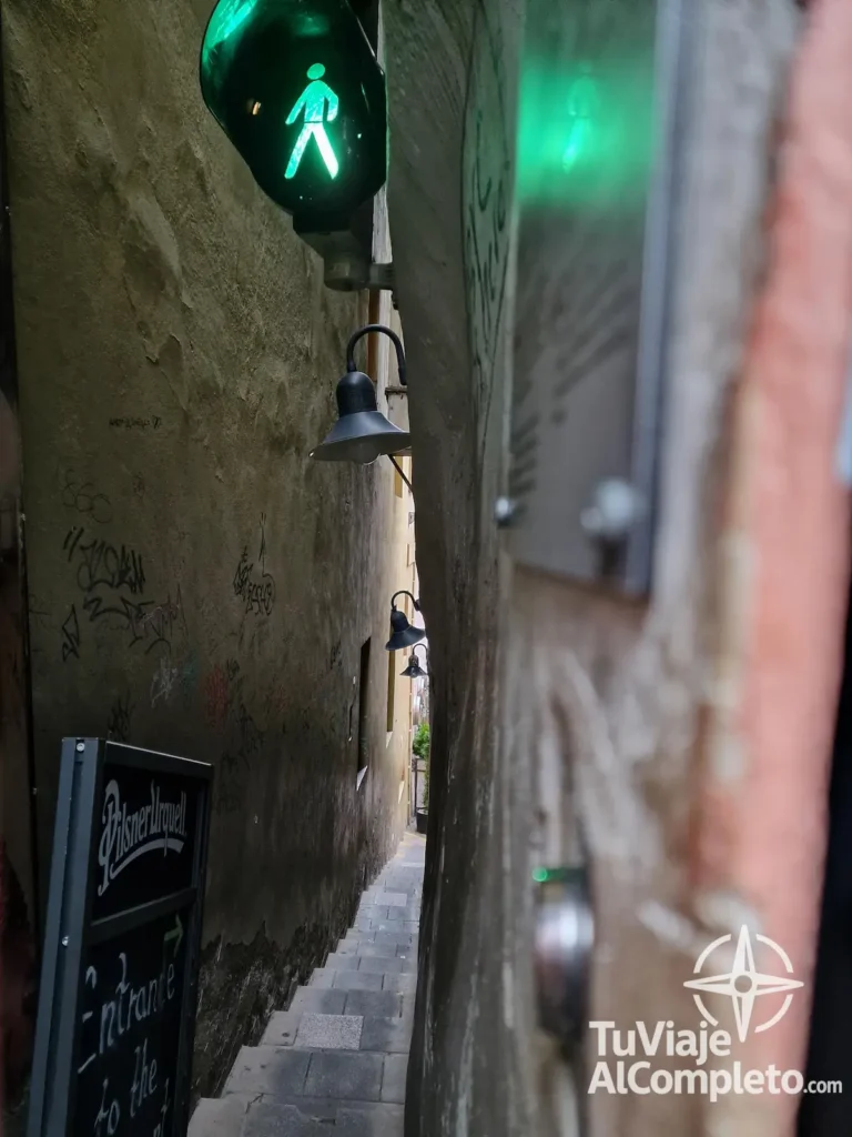 Originalmente era un acceso para conectar las casas con el canal y los molinos cercanos, pero con el tiempo se convirtió en un atractivo turístico por su peculiaridad. Cuando el semáforo se pone en verde, atraviesas un pasadizo empinado que termina en una zona con terrazas junto al agua, lo que lo convierte en un rincón curioso y divertido para añadir a tu lista de cosas que visitar en Praga.