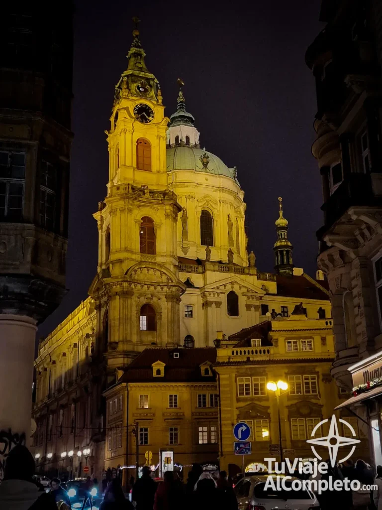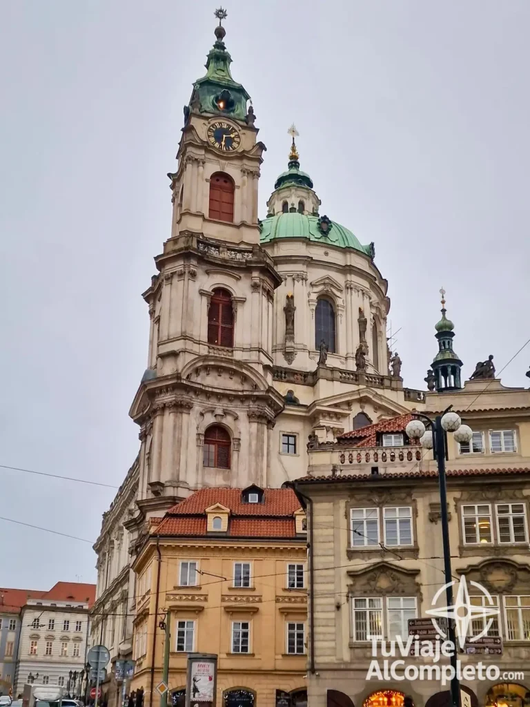 La Iglesia de San Nicolás, en pleno corazón de Malá Strana, es uno de los templos barrocos más impresionantes de Praga. Su enorme cúpula verde y su estilizado campanario son visibles desde muchos puntos de la ciudad.
