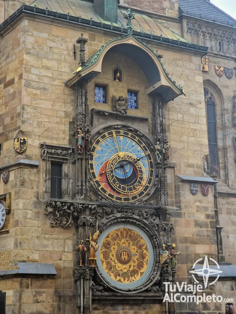 El Reloj Astronómico no solo marca las horas: es una herramienta científica medieval que todavía funciona hoy. Su esfera principal muestra simultáneamente la hora centroeuropea, la hora babilónica, la hora astronómica, la posición del sol y la luna, los signos del zodiaco y el movimiento de los cuerpos celestes. Para su época fue una revolución… y sigue siendo una obra maestra.