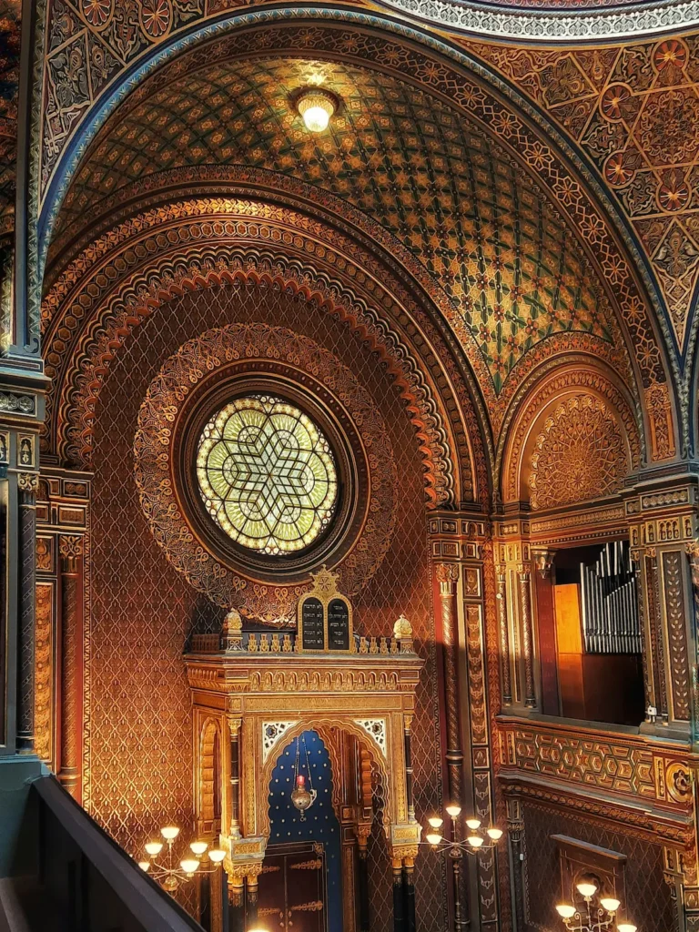 Es para muchos, la más bonita de Praga. Se encuentra en pleno Barrio Judío y debe su nombre a su decoración de estilo mudejar, inspirada en las sinagogas y palacios de la España medieval. Fue construida en 1868 sobre el lugar donde antes se encontraba la Sinagoga Vieja. El interior está cubierto de patrones geométricos, dorados y motivos árabes que la hacen parecer una joya. La iluminación, los colores y los detalles del interior hacen que sea una visita que realmente sorprende.