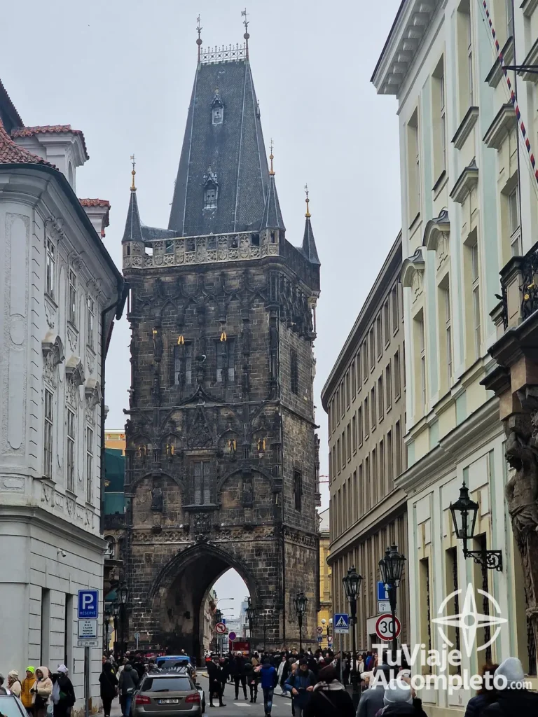 Al final de la calle Celetná aparece la Torre de la Pólvora, uno de los iconos más reconocibles de Praga. Se levantó en 1475 como una de las 13 puertas de la muralla fortificada que daban acceso a la Ciudad Vieja. Su color oscuro, tan característico, se debe al paso del tiempo y a la contaminación acumulada durante siglos.